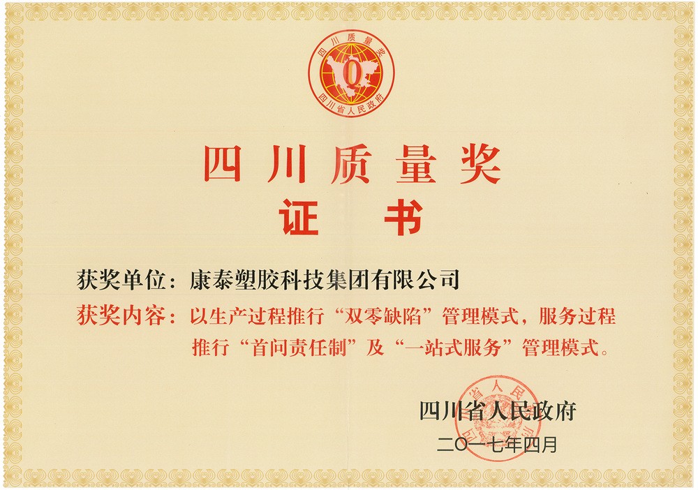 圖為第四屆四川質(zhì)量獎證書